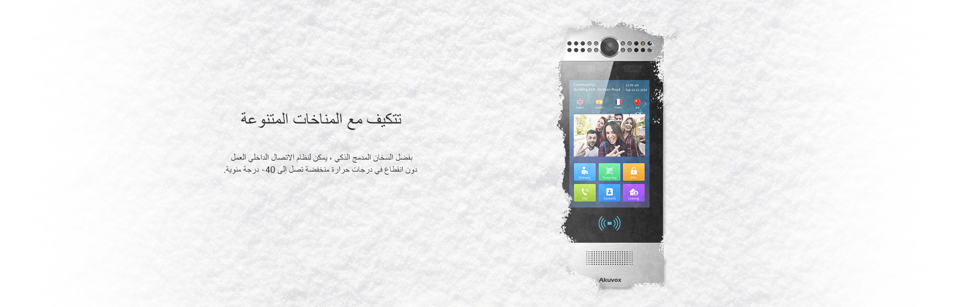 جهاز أكوفوكس انتركوم مع كاميرا مدمجة في بيئة محمية من الظروف الجوية، حيث يظهر الجهاز مزودًا بشاشة عرض تعمل باللمس. في الخلفية، يظهر منظر من الثلج، مما يبرز قدرة الجهاز على العمل في درجات حرارة منخفضة تصل إلى -40 درجة مئوية. تُظهر الصورة قدرة الجهاز على التكيف مع المناخات المتنوعة بفضل أنظمة الأمان والاتصال المتقدمة التي يقدمها، مما يضمن راحة المستخدم في جميع الظروف.