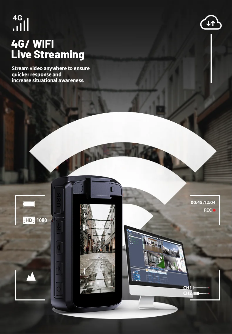 - كاميرا جسد 4G / 4G Body Camera: تدعم البث المباشر عبر اتصال 4G دون الحاجة إلى شبكة واي فاي.